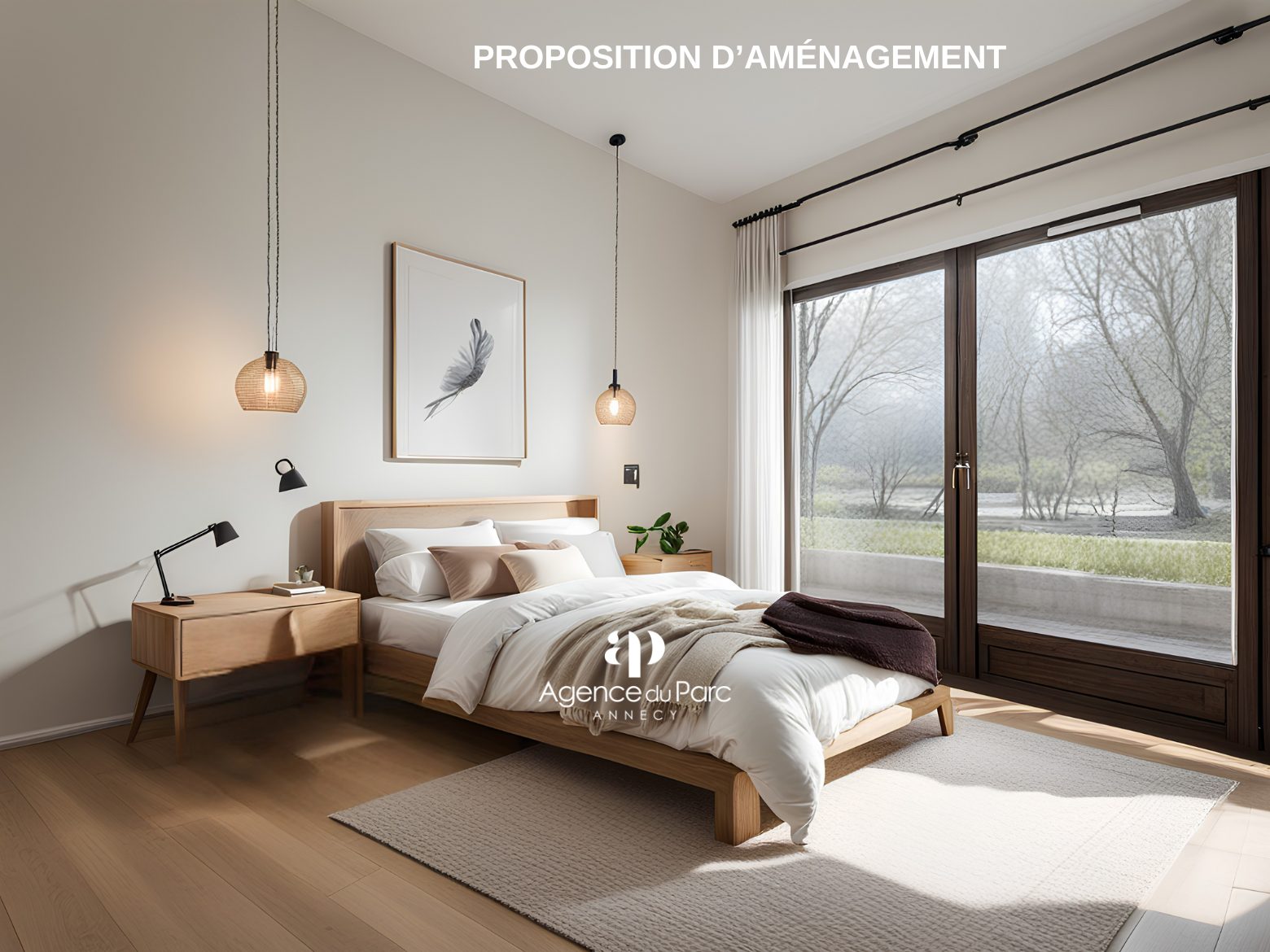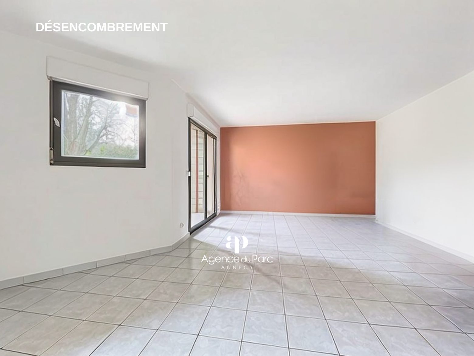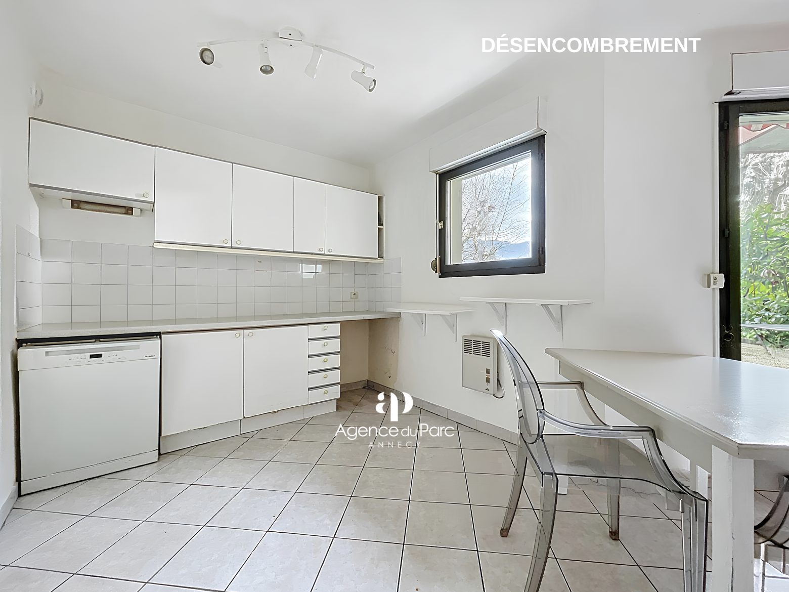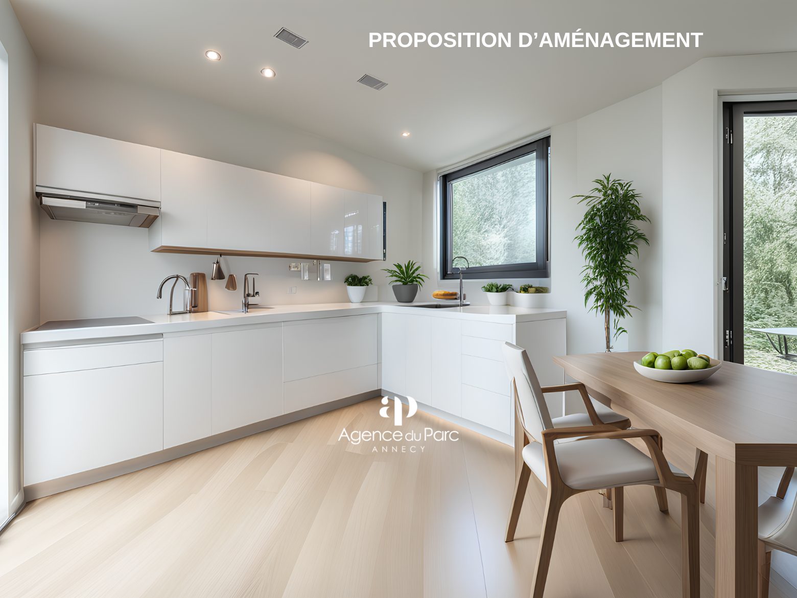 une entrée avec placard, qui donne sur une cuisine équipée, ouverte sur le salon, donnant sur la terrasse de 14 m2 exposée sud, avec vue sur le Semnoz et le jardin, une grande chambre avec placard, donnant également sur la terrasse, une salle de bains avec baignoire, lavabo, sèche serviette et emplacement machine à laver et un WC indépendant,