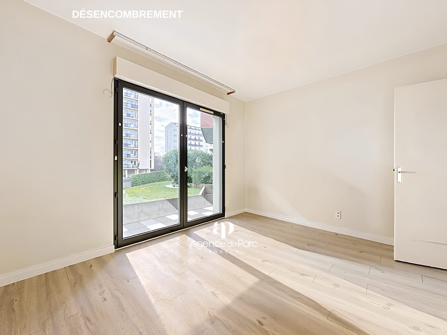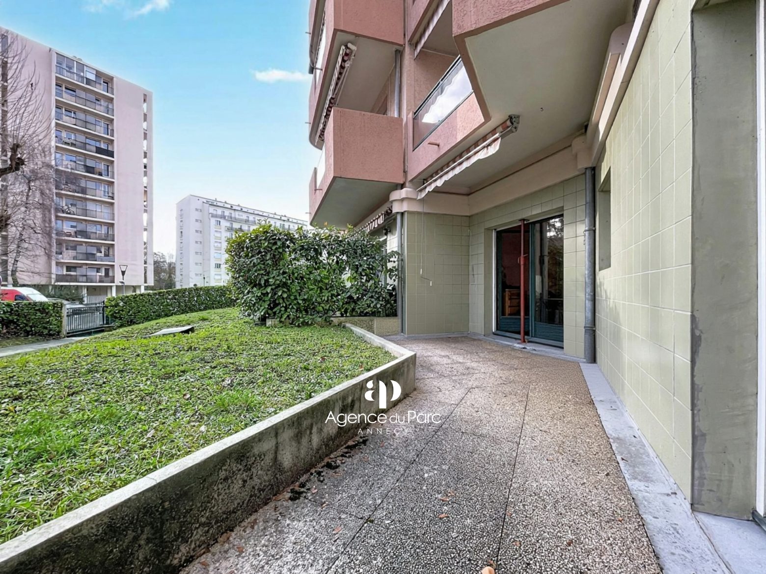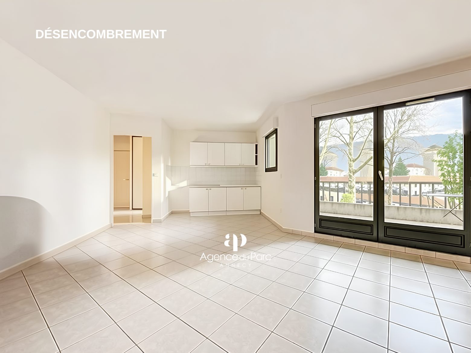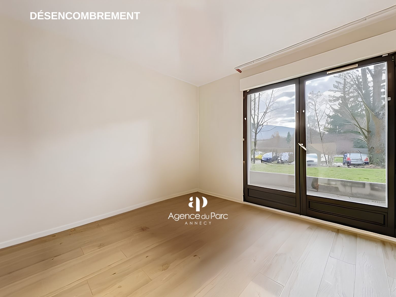 une entrée avec placard, qui donne sur une cuisine équipée, ouverte sur le salon, donnant sur la terrasse de 14 m2 exposée sud, avec vue sur le Semnoz et le jardin, une grande chambre avec placard, donnant également sur la terrasse, une salle de bains avec baignoire, lavabo, sèche serviette et emplacement machine à laver et un WC indépendant,