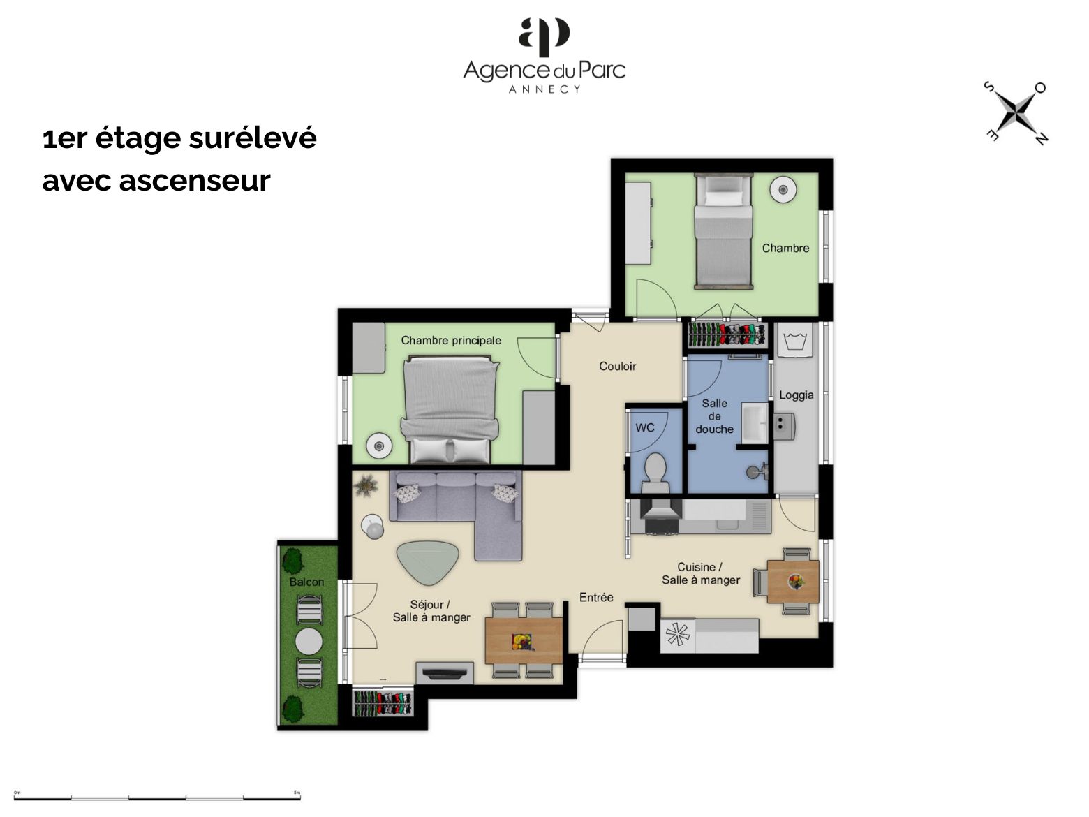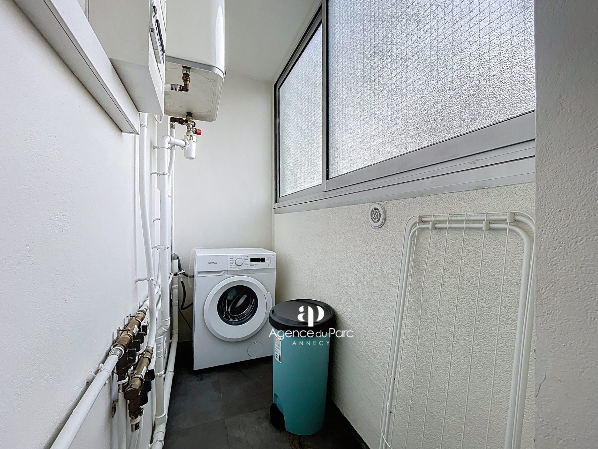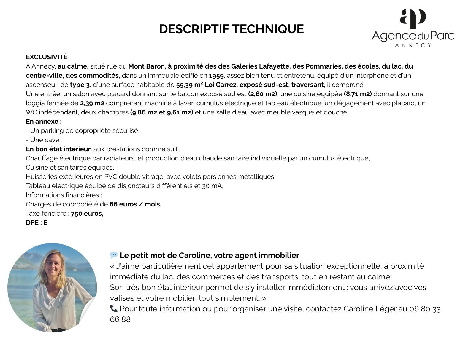 EXCLUSIVITÉ À Annecy, au calme, situé rue du Mont Baron, à 2 pas du lac, à proximité des Galeries Lafayette, des Pommaries, des écoles, du centre-ville, des commodités, dans un immeuble édifié en 1959, assez bien tenu et entretenu, équipé d'un interphone et d’un ascenseur, de type 3, d’une surface habitable de 55,39 m² Loi Carrez, exposé sud-est, traversant, il comprend : Une entrée, un salon avec placard donnant sur le balcon exposé sud est (2,60 m2), une cuisine équipée (8,71 m2) donnant sur une loggia fermée de 2,39 m2 comprenant machine à laver, cumulus électrique et tableau électrique, un dégagement avec placard, un WC indépendant, deux chambres (9,86 m2 et 9,61 m2) et une salle d’eau avec meuble vasque et douche,