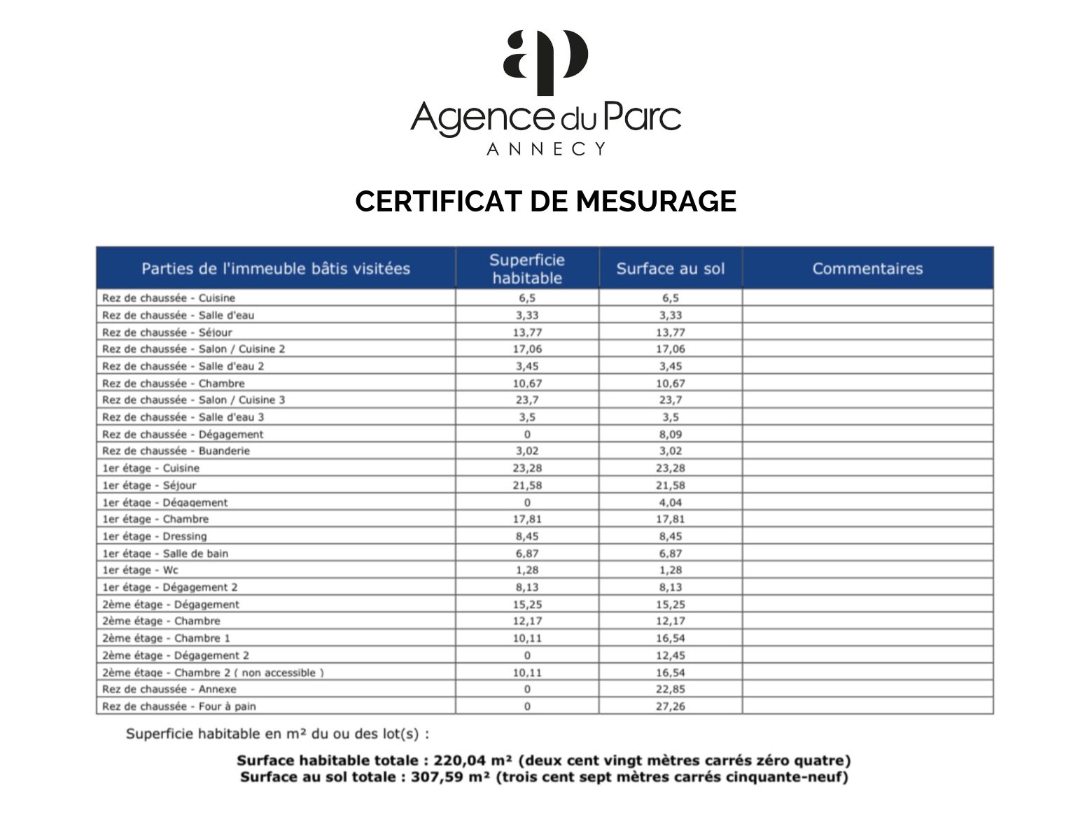 - à l’étage : un appartement de type 5 de 135,04 m2 environ comprenant un salon de 21,58 m2 avec cheminée donnant sur le balcon avec vue dégagée sur les montagnes, une cuisine équipée ouverte sur la salle à manger de 23,28 m2, un dégagement avec placard, une chambre de 17,81 m2 donnant sur un dressing, un WC indépendant, une salle d’eau avec douche italienne, meuble vasque et emplacement machine à laver, au second niveau, une salle de billard et trois chambres (12,17 m2, 10,11 m2 et 10,11 m2),