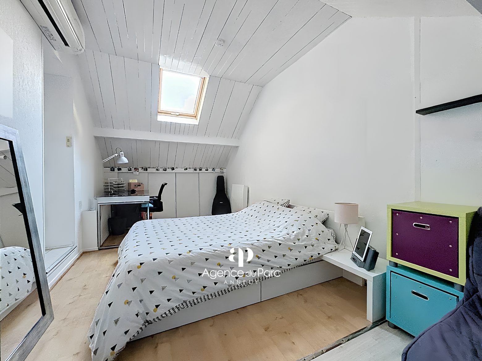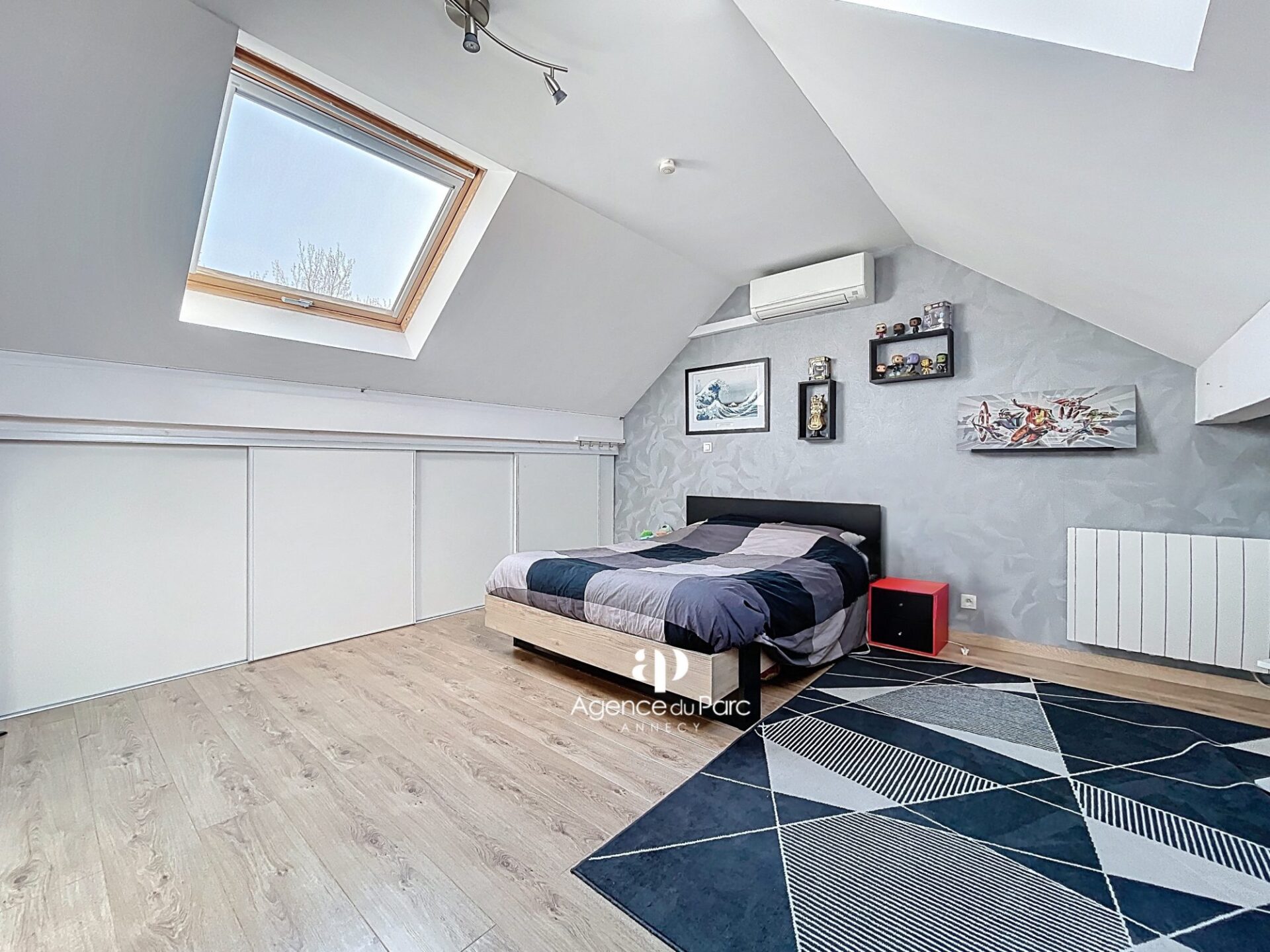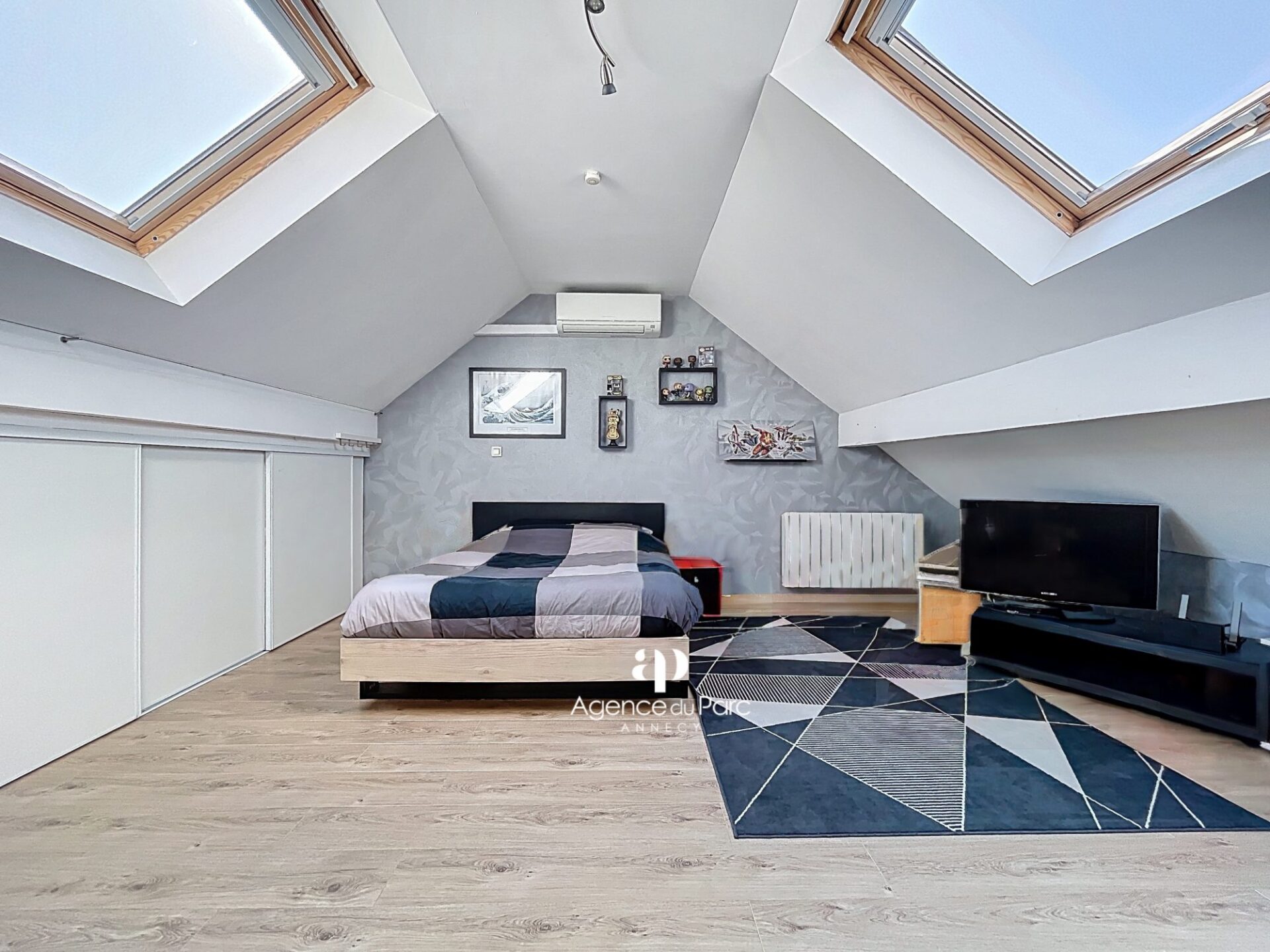 dans les combles, une grande chambre en sous pente de 14,98 m2 Loi Carrez (+ 15,67 m2 au sol) avec placards aménagés, avec possibilité d’aménager une salle d’eau,