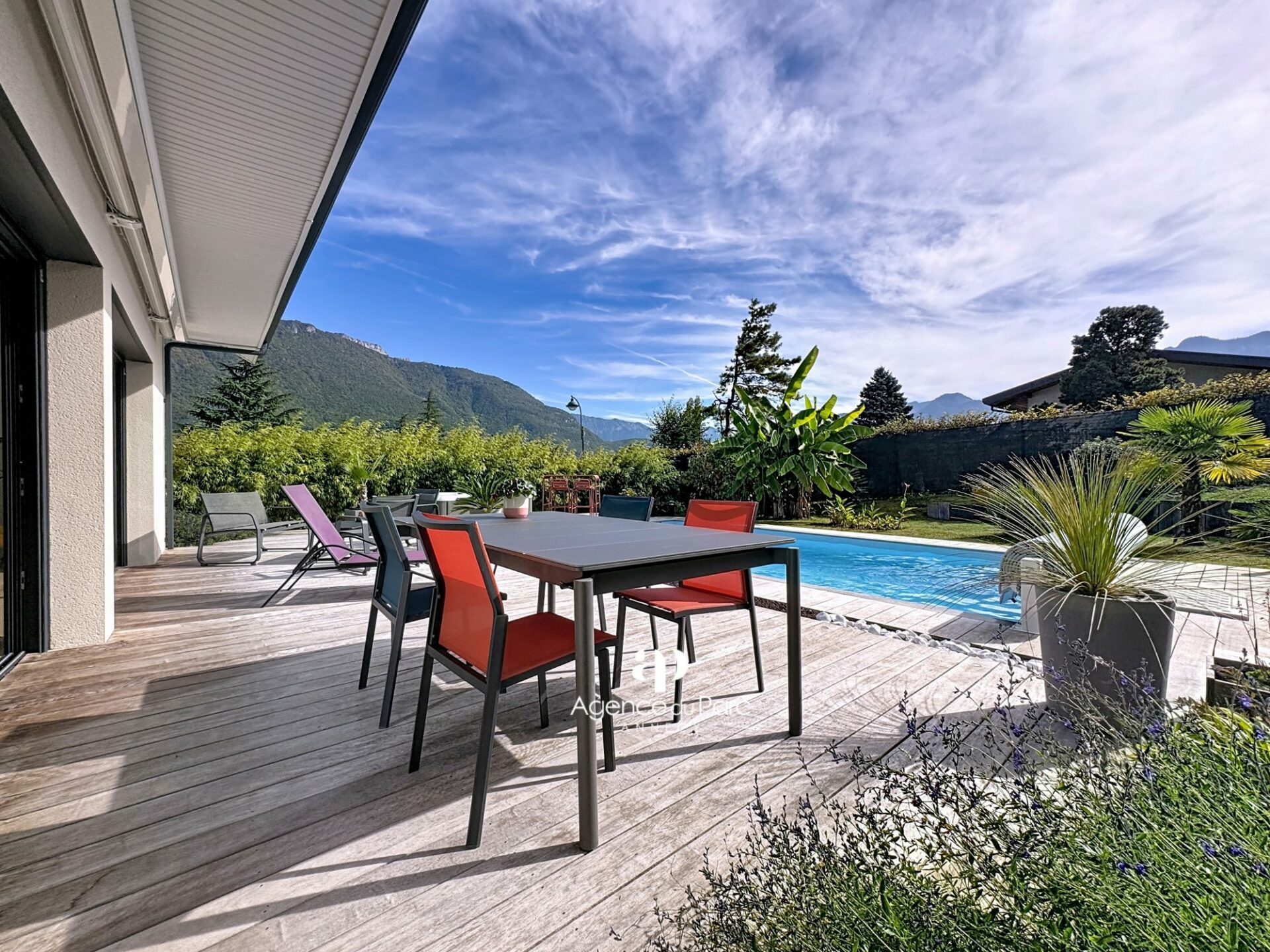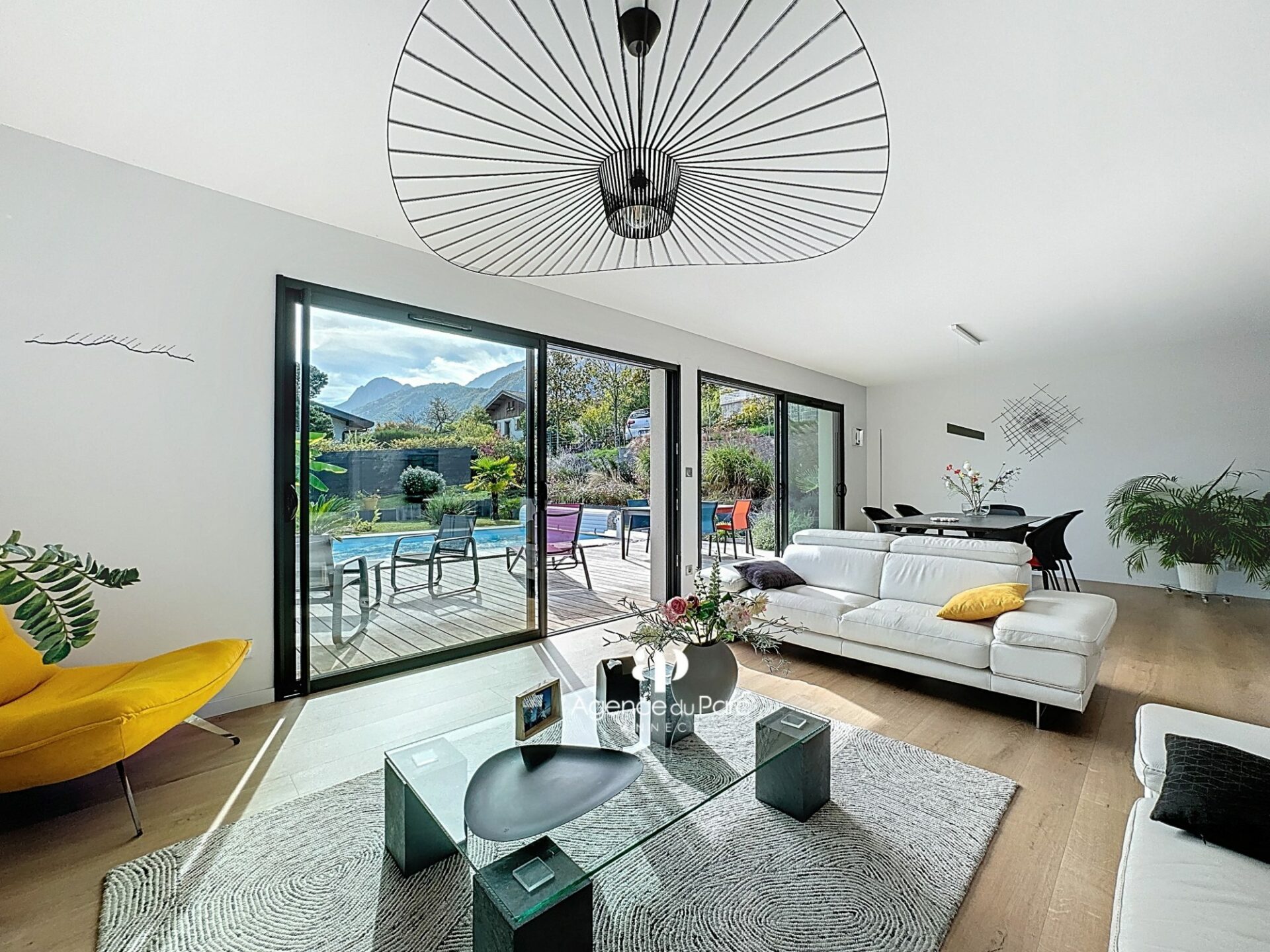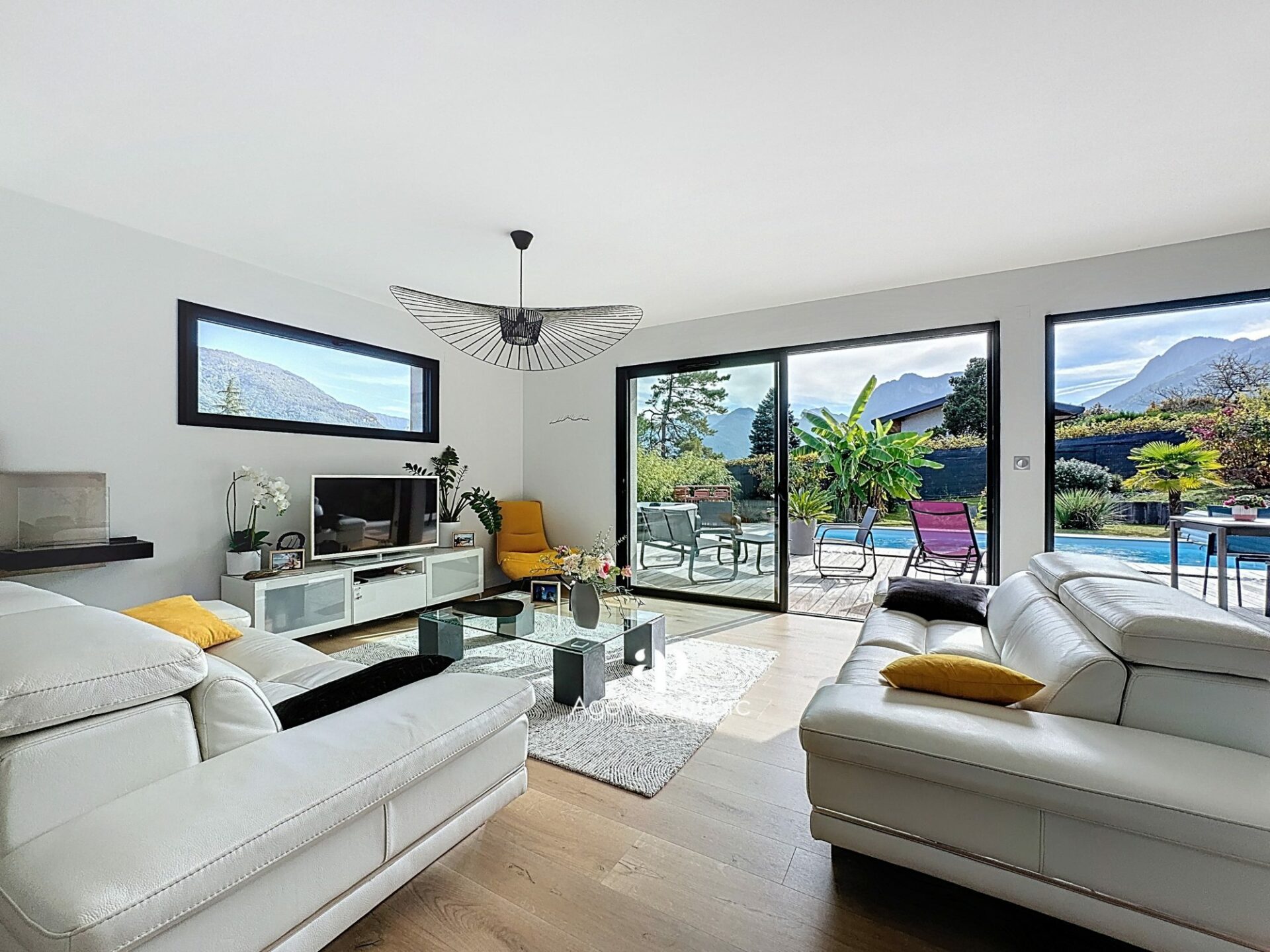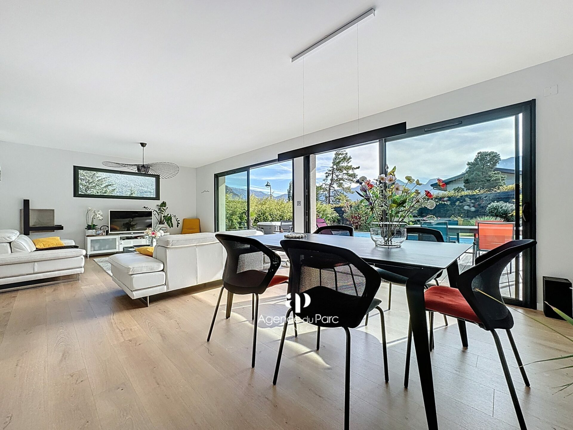 À Doussard, dans le secteur du Chaparon, dans un environnement résidentiel recherché, sur la rive ouest du lac proche d’Annecy, des commerces et des axes routiers, entre Duingt et le centre de Doussard, au calme, votre future villa, avec vue sur les montagnes environnantes, sur un terrain de 585 m² environ, plat, paysager et en grande partie clos, exposée plein sud, indépendante sur deux niveaux, édifiée en 2019, d’une surface habitable de 111,95 m² environ, parfaitement bien équipée et soignée, aux prestations modernes offre un grand confort de vie, elle comprend :