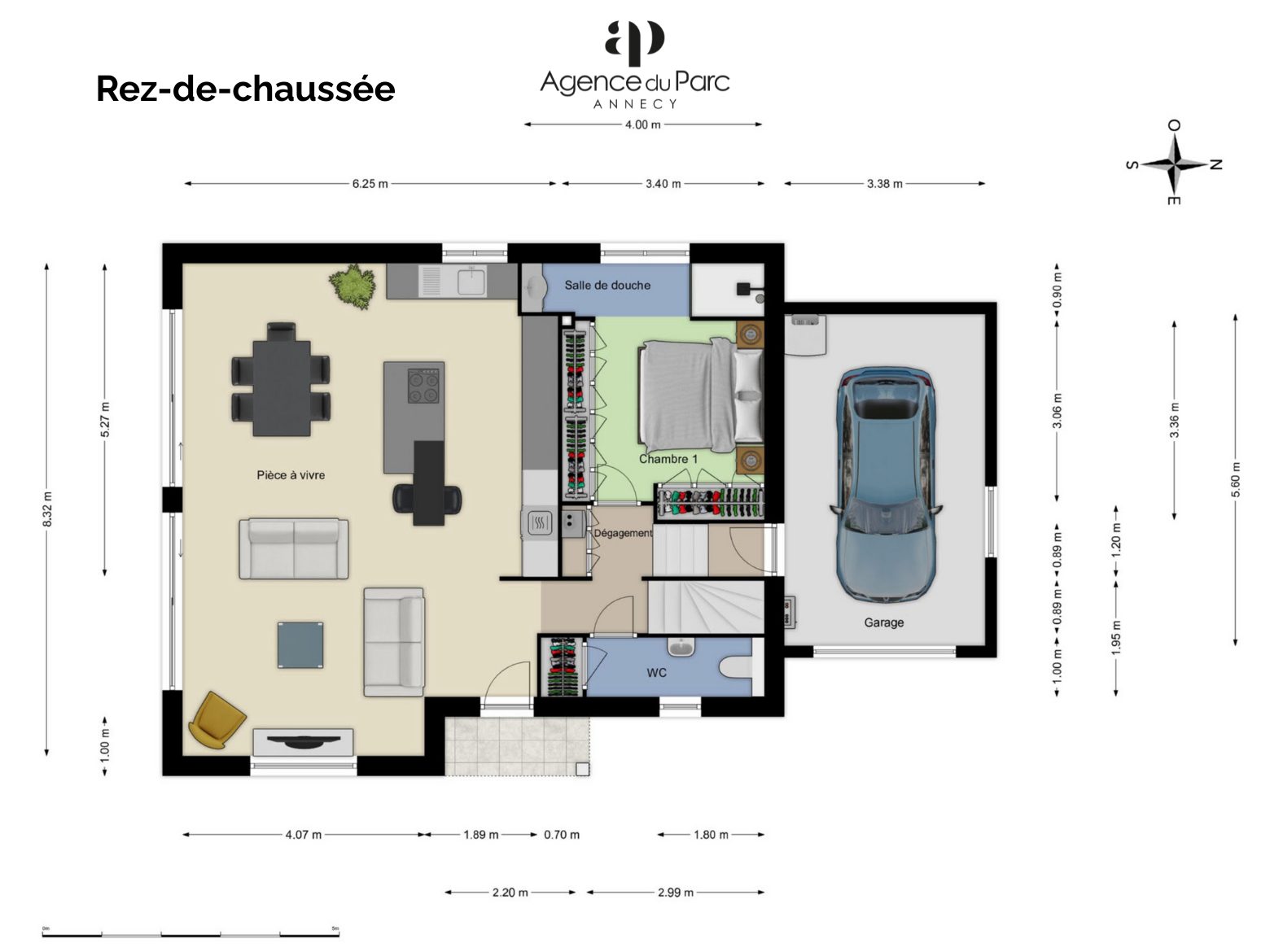 En demi-niveau inférieur, un garage 19 m² avec porte sectionnelle motorisée, combles aménageables au-dessus avec possibilité de créer un bureau ou une chambre,